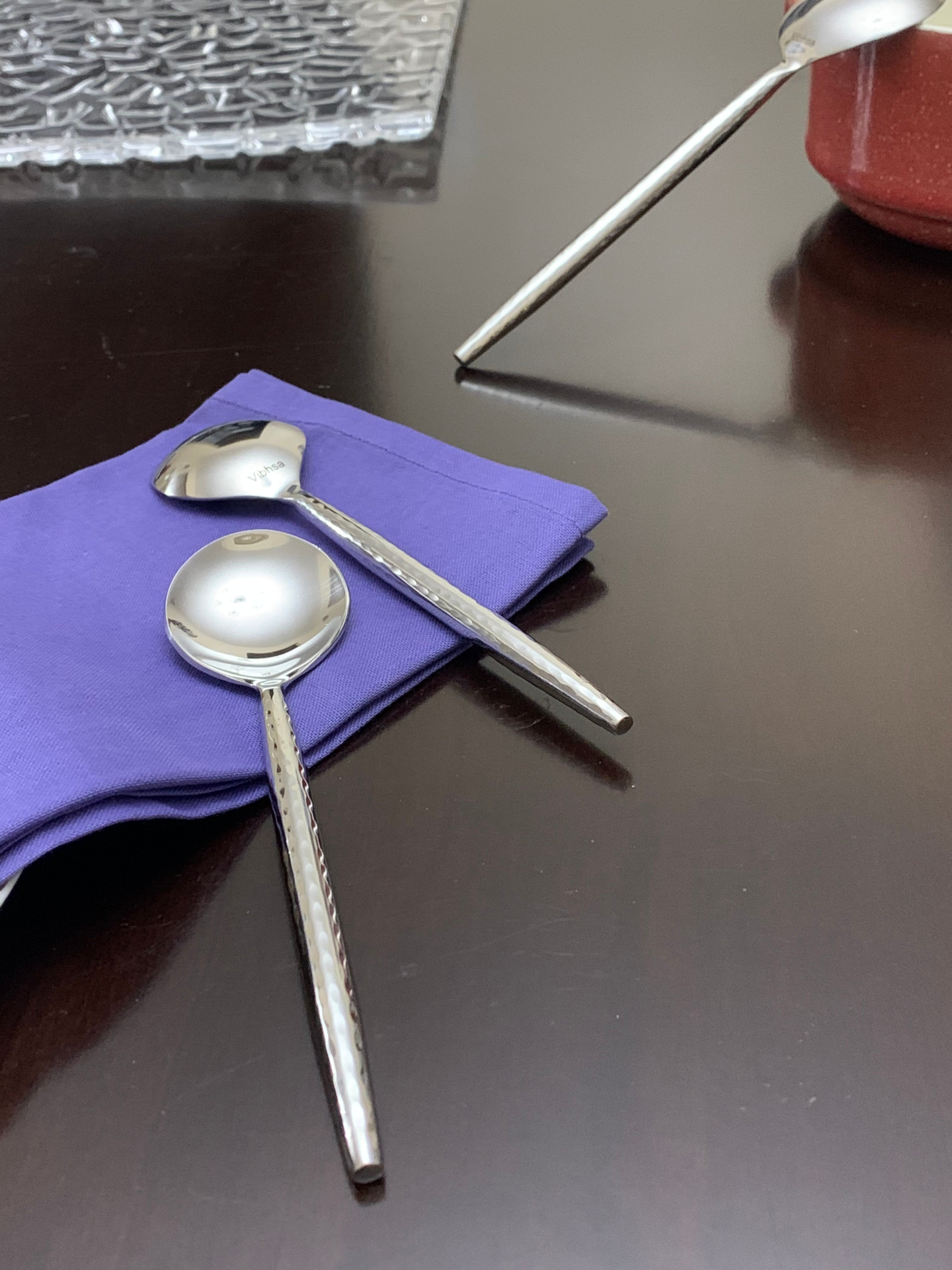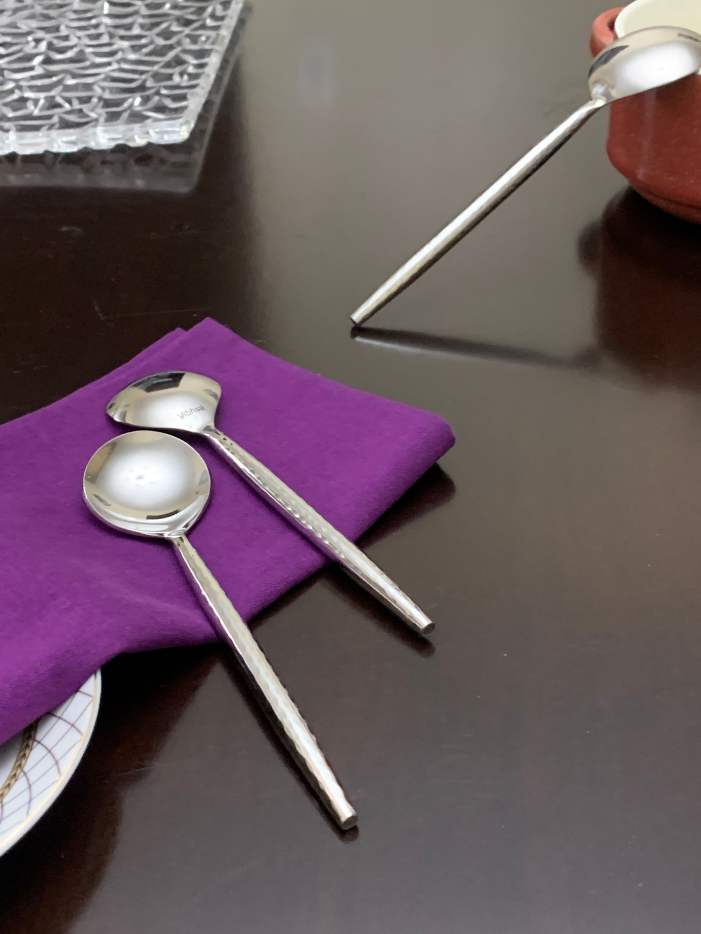 - Made by artisan Stainless Steel cutlery set. Hammered designed handle with High Gloss Finish gives a classic look to your parties