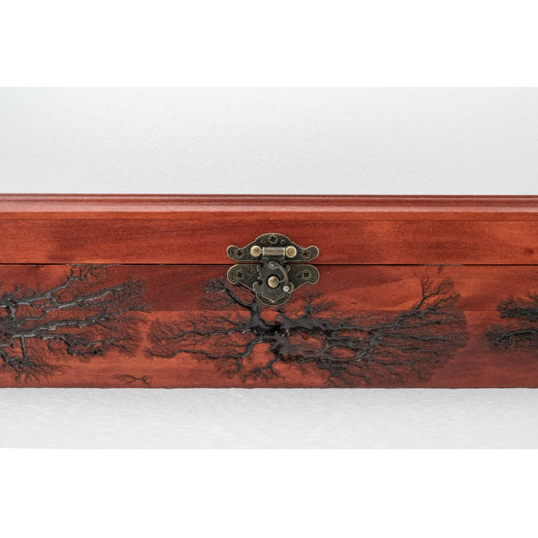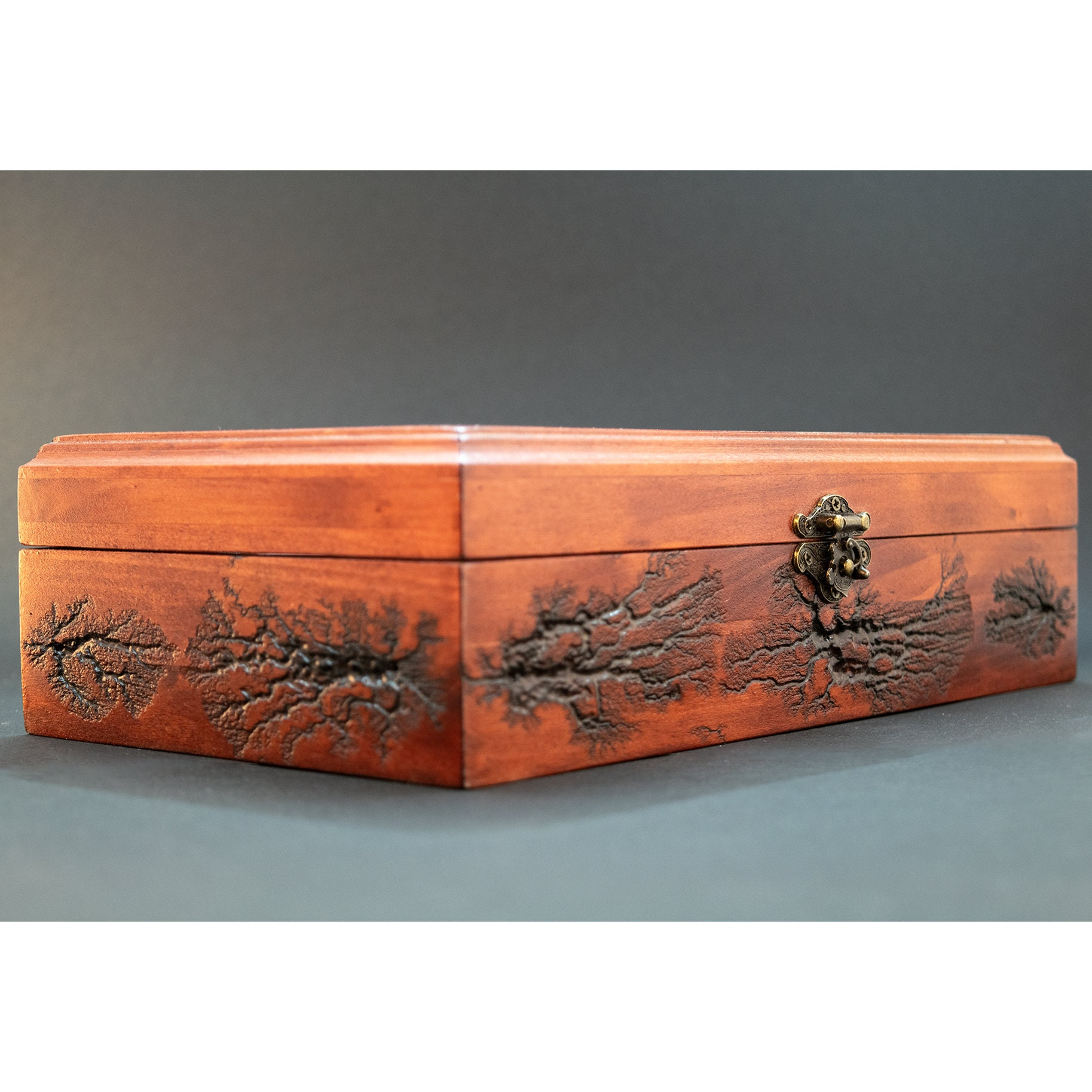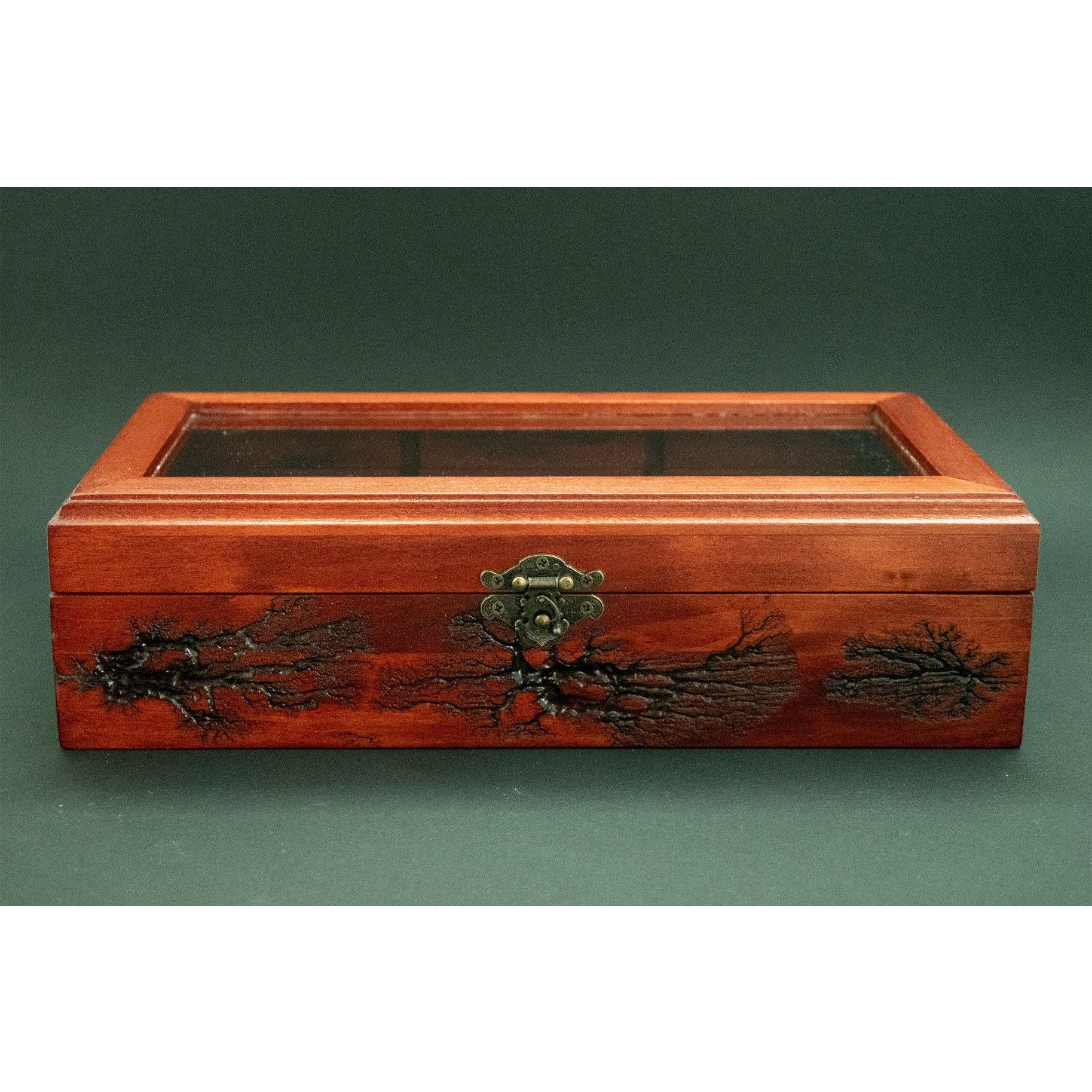 Watch box made of solid linden wood, that holds 6 large watches up to 54mm. Handmade watch display case using the amazing Lichtenberg buring method to create the unique natural aesthetics. This watch organizer can be called a piece of art because of the method used to create the design. By passing electricity at very high voltage between two electrodes while they are in contact with the wooden box I create the distinctive and individual natural forms on the box. Box dimensions: * Length: 12 inches * Width: 6 inches * Height 2.8 inches * Material : linden wood * Capacity: 6 pcs watch PILLOWS ARE INCLUDED IN THE PACKAGE Shipping and production: The production time is 3 to 5 business days after purchase. Orders are shipped by USPS, shipping includes a tracking number. It takes 12 to 15 working days after the day of dispatch for shipments to arrive in European Union countries. It takes 14 to 18 working days after the day of dispatch for shipments to arrive in US
