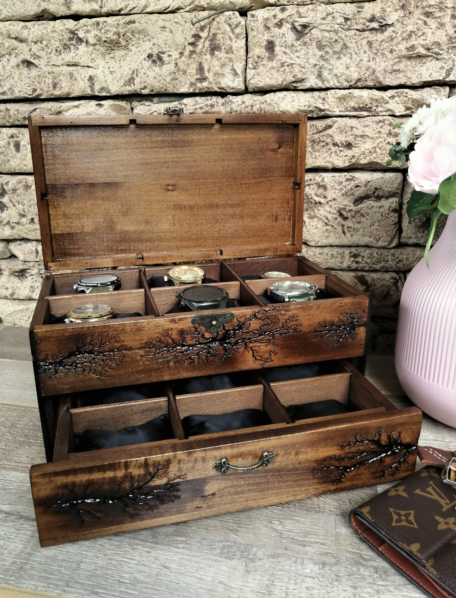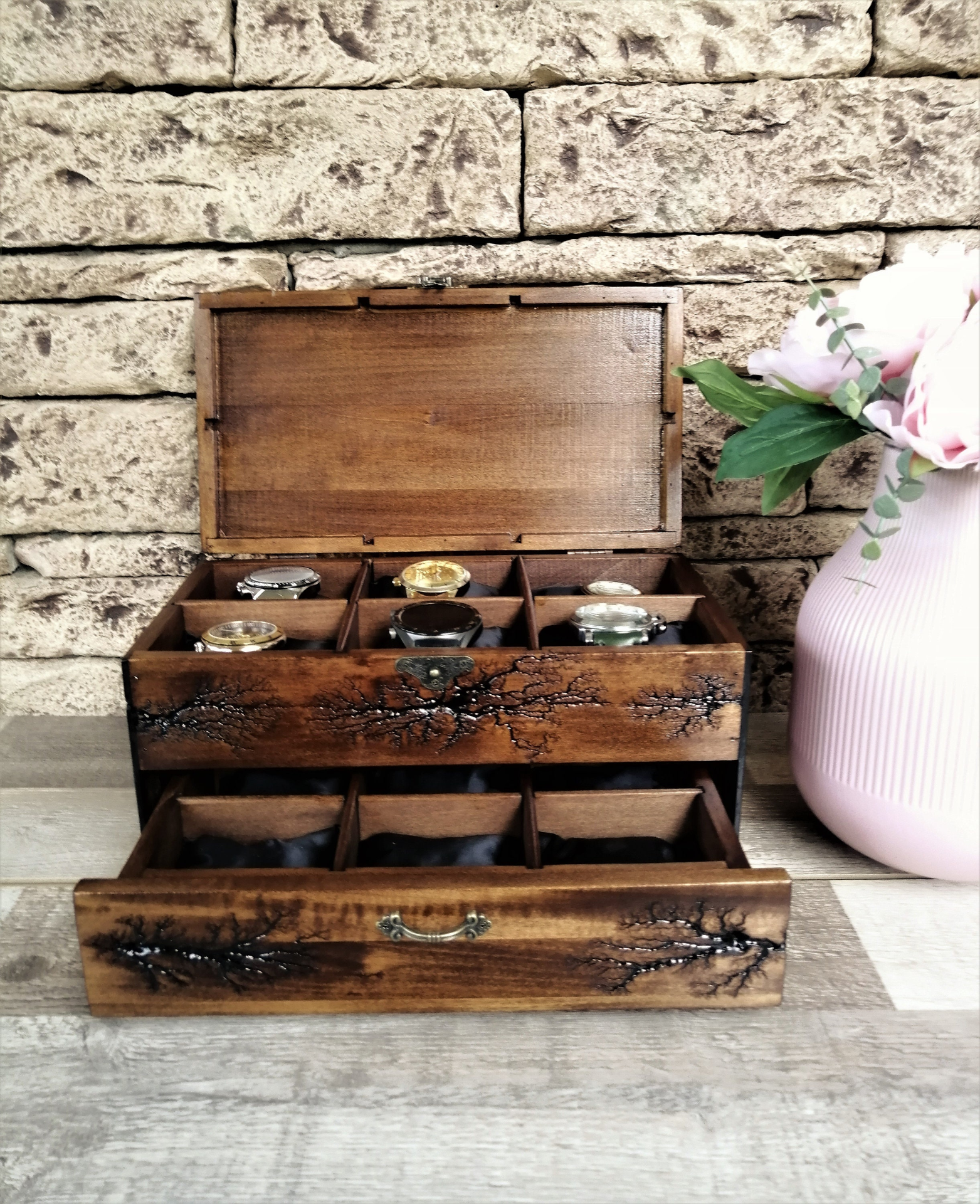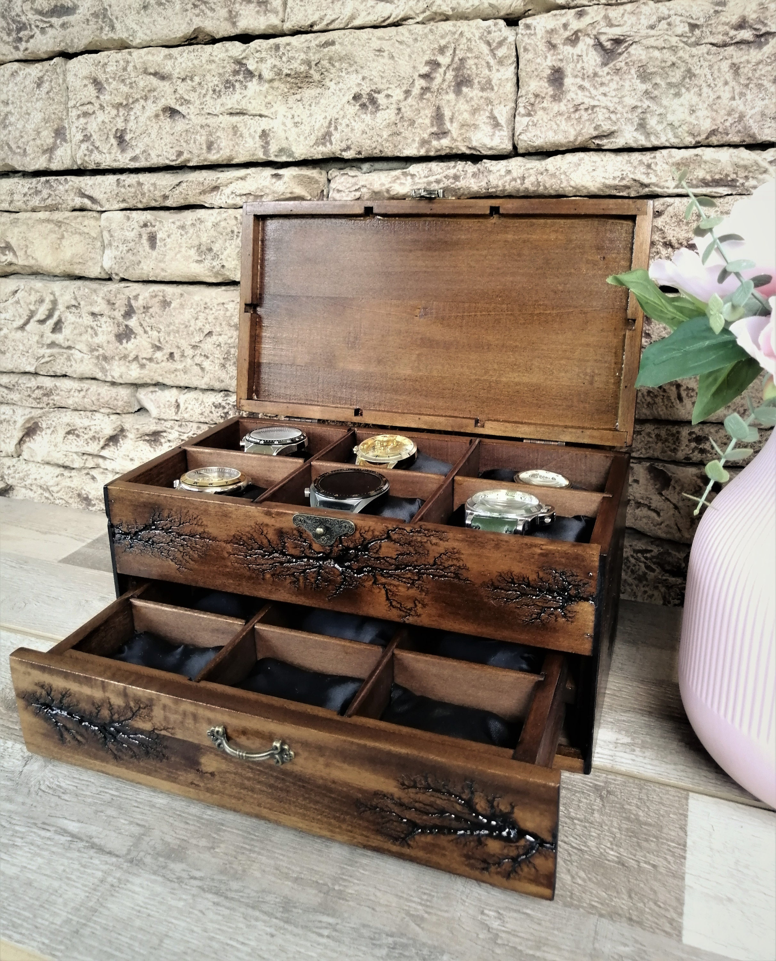 Unique handmade watch box with a drawer fit 12 watches. This box will look good and as beautiful furniture in your home. I did it with a lichtenberg figure burning technique. This is the perfect gift for all men who love watches or collectors. This watch box made of solid linden wood, that holds 6 large watches up to 54mm. at the top of the box, and in the drawer 6 smaller ones up to 36mm. Now you will not worry about your expensive pieces, because they will be in a safe place. This box is not only necessary for watch lovers, but it will also be beautiful furniture in your home. The perfect gift for a loved one, husband, friend, dad's gift, or a stylish business gift. For 7 years VOLDOR 69 has been producing some of the most beautiful watch cases on the market. Before I draw your attention to the description of the box, I want to tell you about the method of fractal burning of Leichtenberg. This method of decoration uses an extremely high voltage of 10,000 volts. Models of the structure of the tree cause electricity to form a very specific picture, such as a plant, a tree or lightning. Watching the high voltage work on the tree is like watching a plant grow at a super rate. This is the only unique art of burning wood, but it is very, very dangerous. Please do not try alone, knowledge skills and experience are required, it is dangerous for your life. I have many years of experience, let me make a beautiful box for your priceless watches with unique Leichtenberg figures for you. Box dimensions: Box dimensions: * Length: 12 inches * Width: 8 inches * Height: 7 inches * Material : linden wood * Capacity: 12 pcs watch This item ships 3 to 5 business days after purchase. Orders are shipped by USPS, shipping included with tracking number. It takes 12 to 15 working days after the day of dispatch for shipments to arrive in European Union countries.