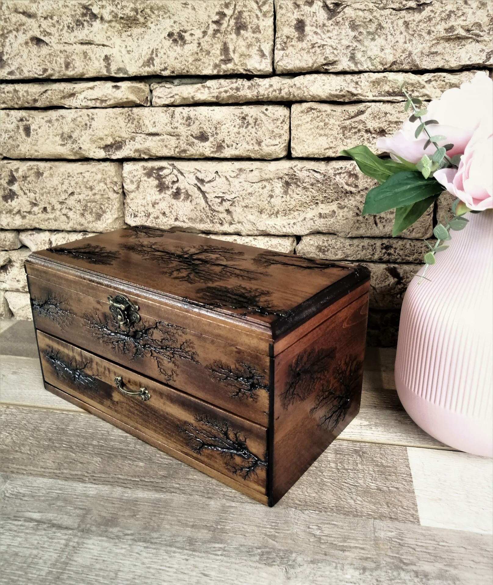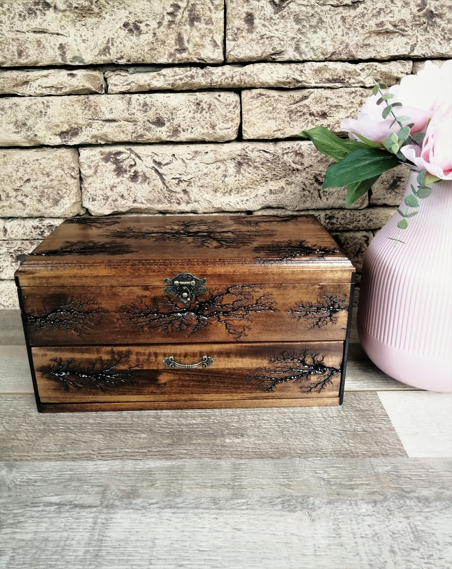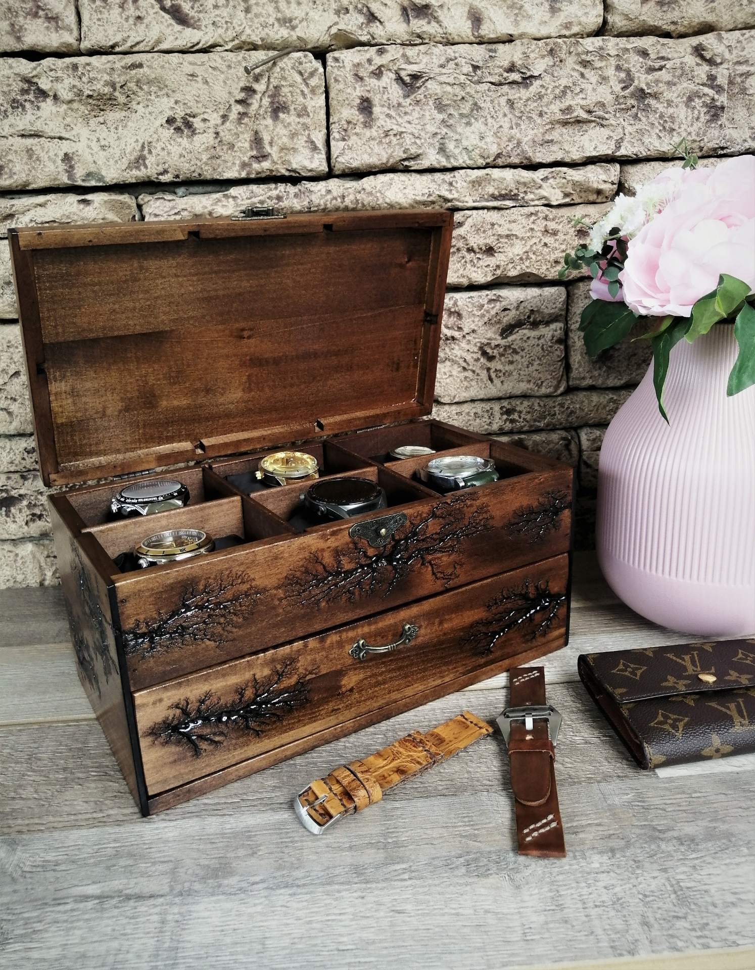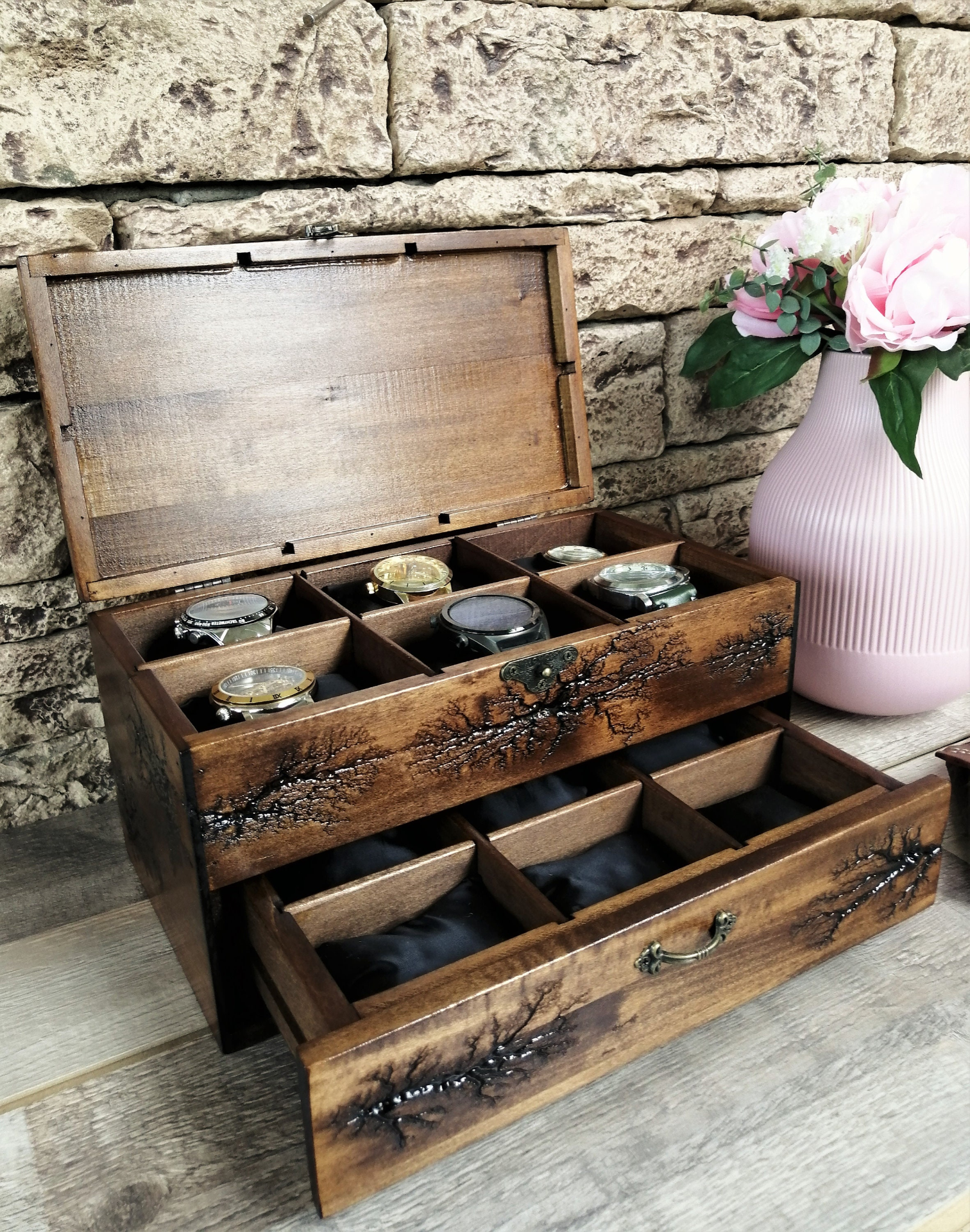 Unique handmade watch box with a drawer fit 12 watches. This box will look good and as beautiful furniture in your home. I did it with a lichtenberg figure burning technique. This is the perfect gift for all men who love watches or collectors. This watch box made of solid linden wood, that holds 6 large watches up to 54mm. at the top of the box, and in the drawer 6 smaller ones up to 36mm. Now you will not worry about your expensive pieces, because they will be in a safe place. This box is not only necessary for watch lovers, but it will also be beautiful furniture in your home. The perfect gift for a loved one, husband, friend, dad's gift, or a stylish business gift. For 7 years VOLDOR 69 has been producing some of the most beautiful watch cases on the market. Before I draw your attention to the description of the box, I want to tell you about the method of fractal burning of Leichtenberg. This method of decoration uses an extremely high voltage of 10,000 volts. Models of the structure of the tree cause electricity to form a very specific picture, such as a plant, a tree or lightning. Watching the high voltage work on the tree is like watching a plant grow at a super rate. This is the only unique art of burning wood, but it is very, very dangerous. Please do not try alone, knowledge skills and experience are required, it is dangerous for your life. I have many years of experience, let me make a beautiful box for your priceless watches with unique Leichtenberg figures for you. Box dimensions: Box dimensions: * Length: 12 inches * Width: 8 inches * Height: 7 inches * Material : linden wood * Capacity: 12 pcs watch This item ships 3 to 5 business days after purchase. Orders are shipped by USPS, shipping included with tracking number. It takes 12 to 15 working days after the day of dispatch for shipments to arrive in European Union countries.