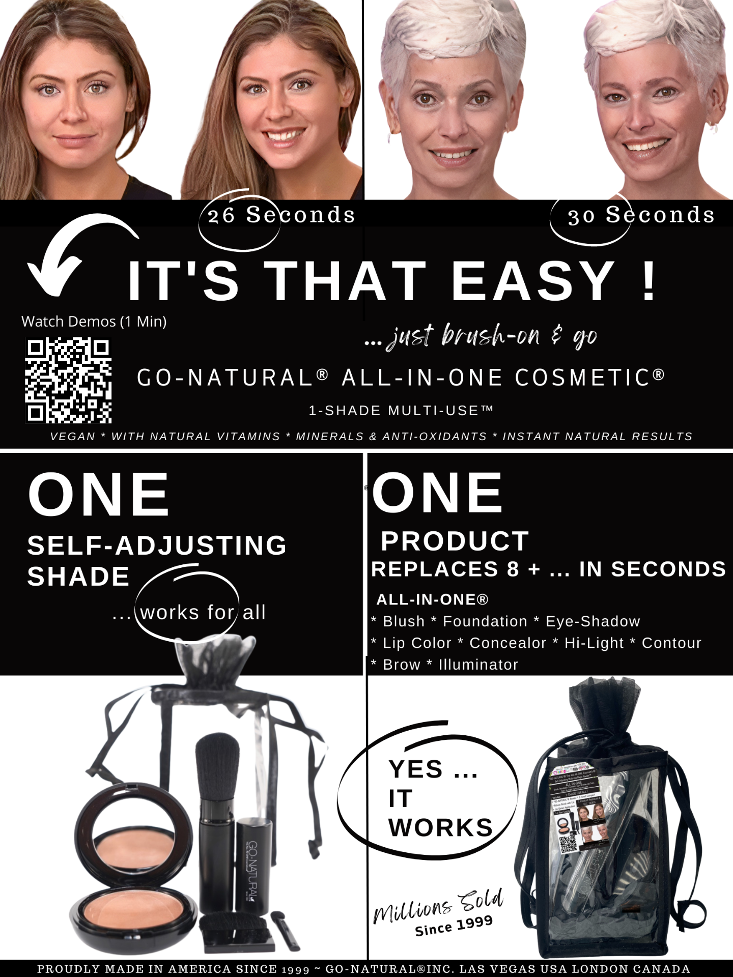* 1-SKU Replaces 8 Cosmetics ! - in seconds: is Blush, Foundation, Eye-Shadow, Lip Color, Brow Color, Hi-Light, Contour, Illuminator ALL-IN-ONE®