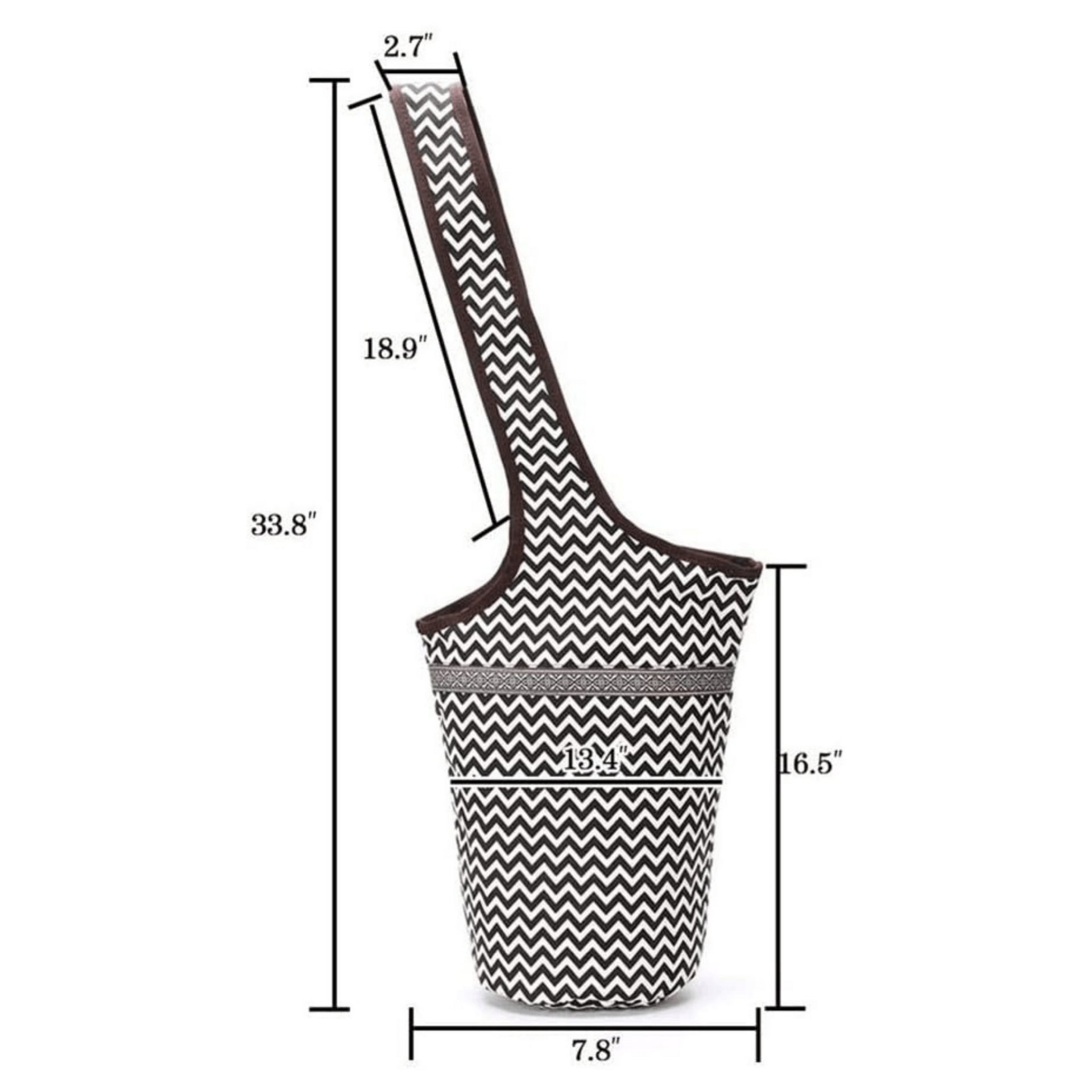 - Yoga Mat Bag Size: 34" length including shoulder strap, 13.6" width on the top, and 12" width on the bottom.